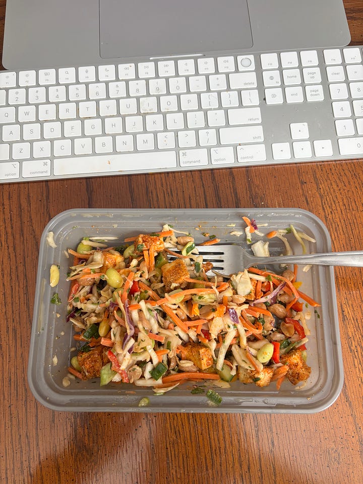 Lunch: Thai peanut slaw salad with tofu; brown rice, quinoa, black bean mix + avocado; Prime peanut butter protein bar