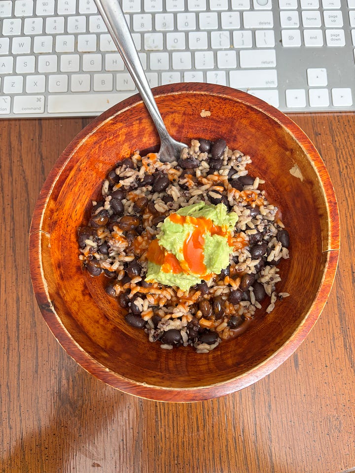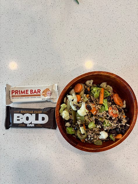 Lunch: Quinoa, brown rice, black bean mix + mixed veggies; Prime protein bar and BOLD Mocha chip caffeinated protein bar