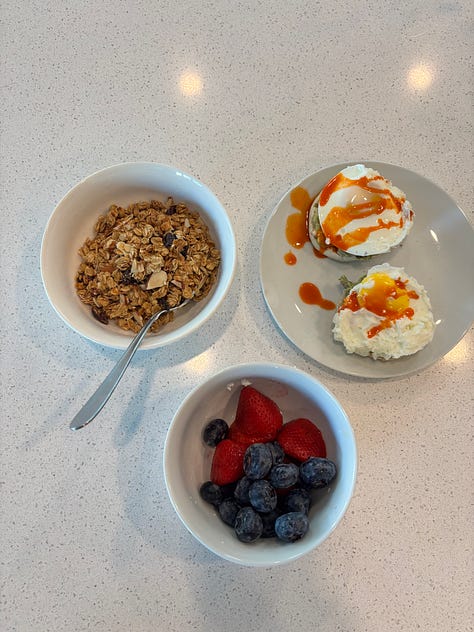 Breakfast: Chobani Greek yogurt and granola; English muffin with 2 eggs and avocado; mixed berries