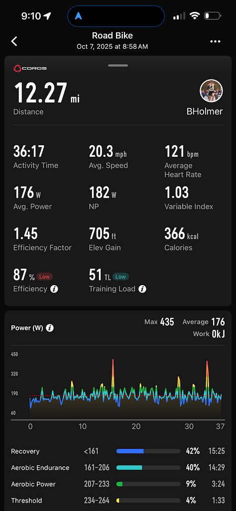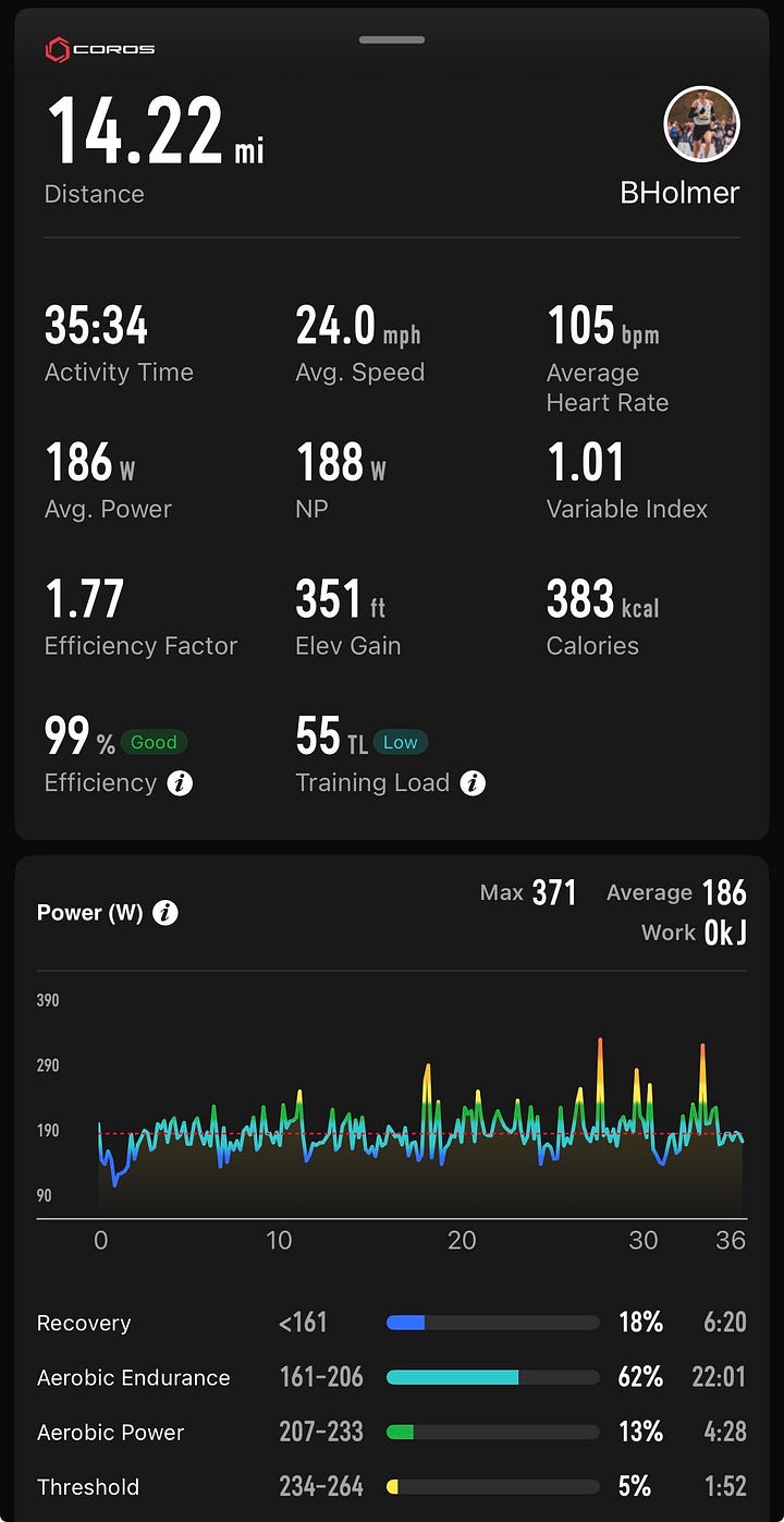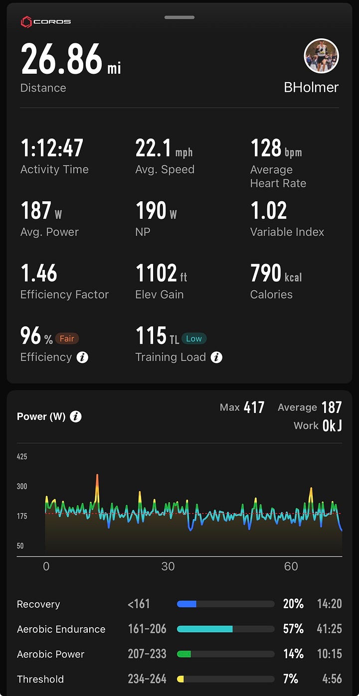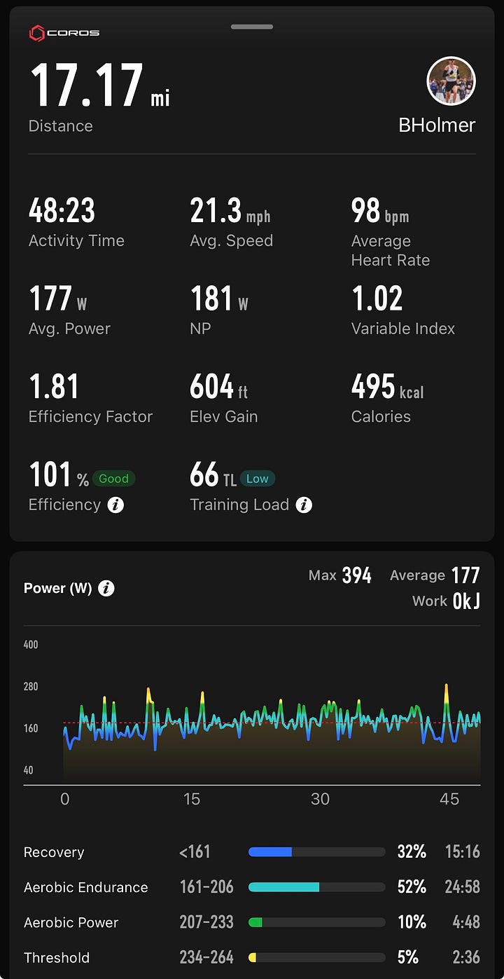 Workout: 11 miles easy + 35-minute indoor Zwift ride