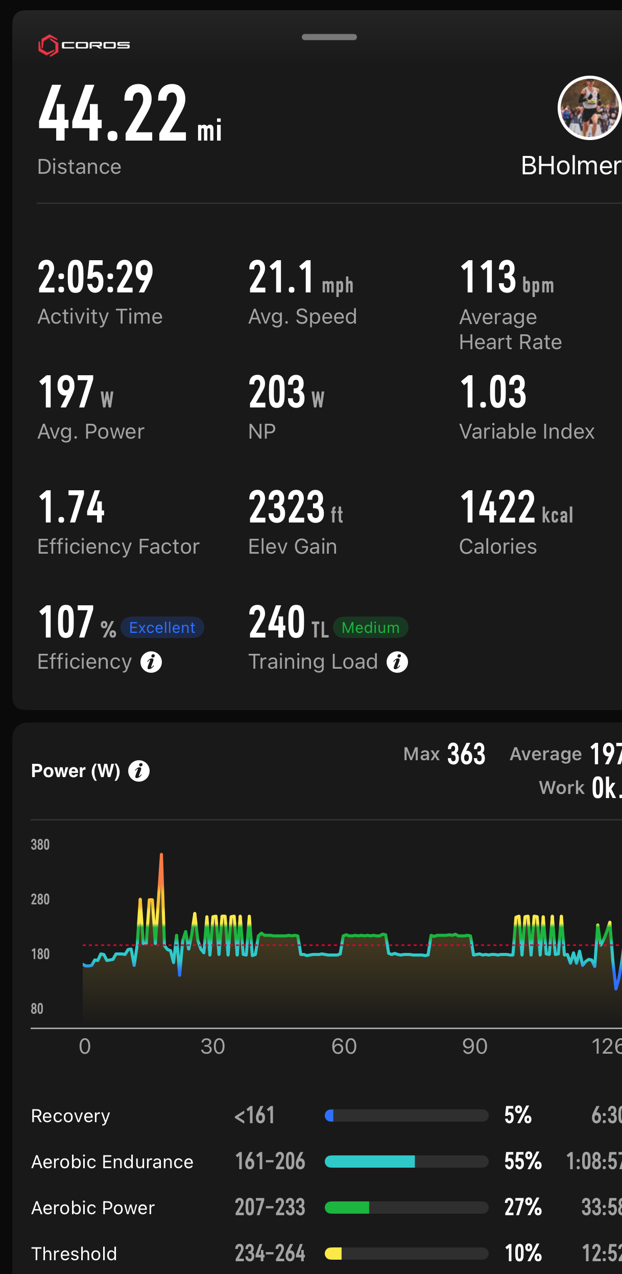 Workout: 2 hour 5 minute indoor Zwift ride (mix of aerobic intervals and some steady-state aerobic riding)