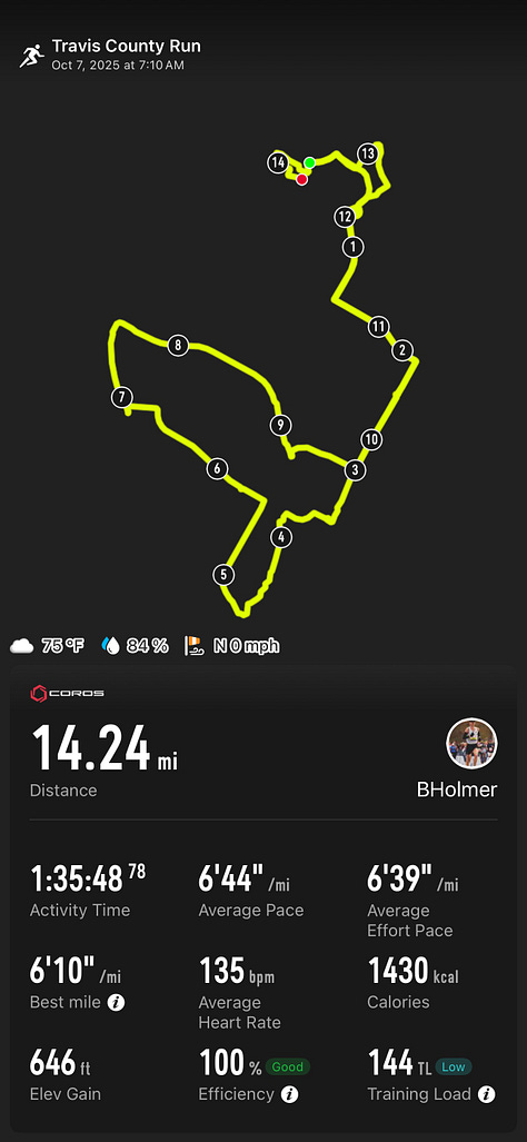 This week marked week 4 of 12 of my official build toward the California International Marathon (CIM) on December 7, 2025. Each week, I’ll be sharing data, insights, and other information about my training and process. I did something similar for the 2025 Boston Marathon, and the feedback was positive enough that I decided to do it again! You can find week 1 of the training log here, week 2 here, and week 3 here. This week, in addition to the usual training stats, I’m sharing two examples of “what I eat in a day” during training. I’ve also provided the relevant nutrition data (I’ve been using an app called Alma to track my intake. It’s imprecise, but it's holding me accountable).