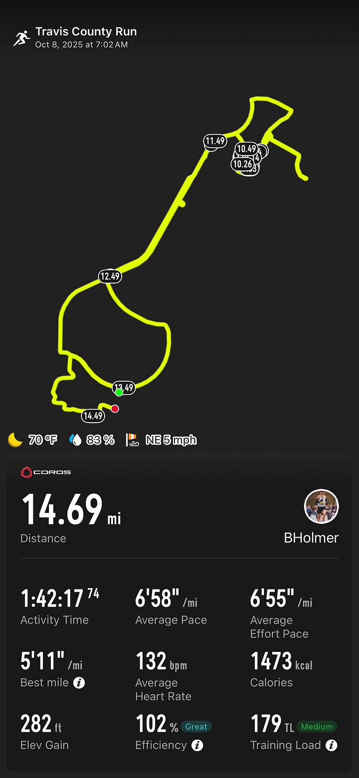 Workout: 14-mile easy run + 35-minute indoor Zwift ride