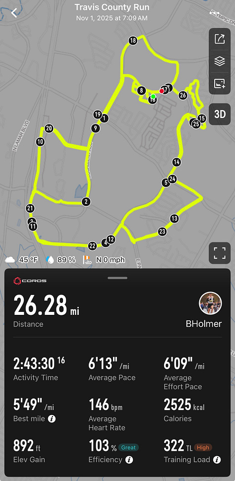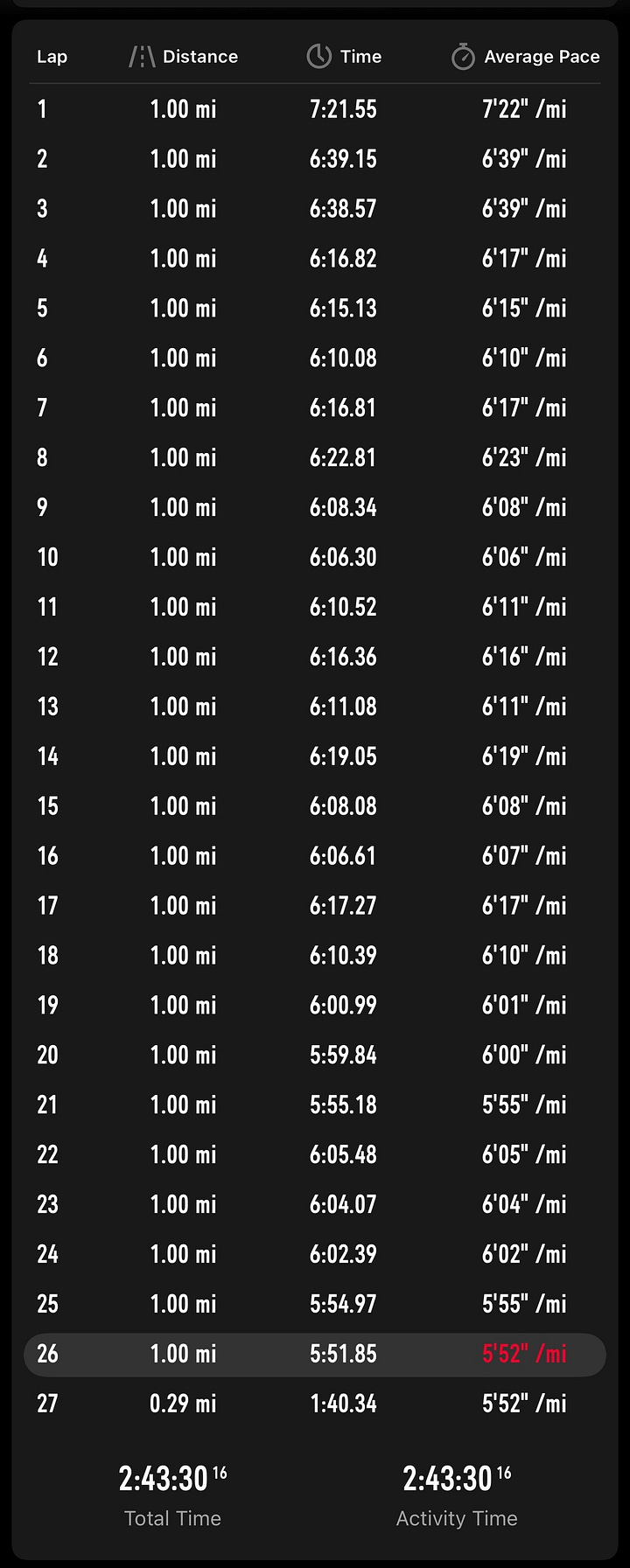 Workout: 26.2 miles at ~85% of goal marathon pace