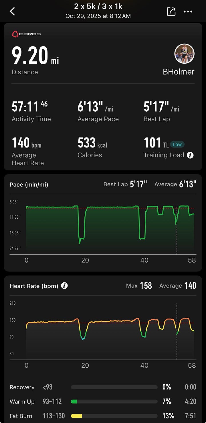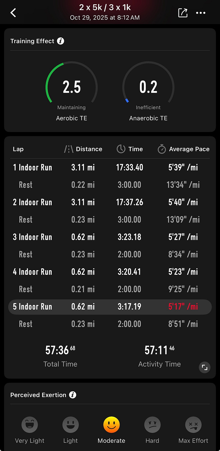 Workout: 2 x 5k + 3 x 1k with a 3-mile warmup and cooldown (to and from the gym)