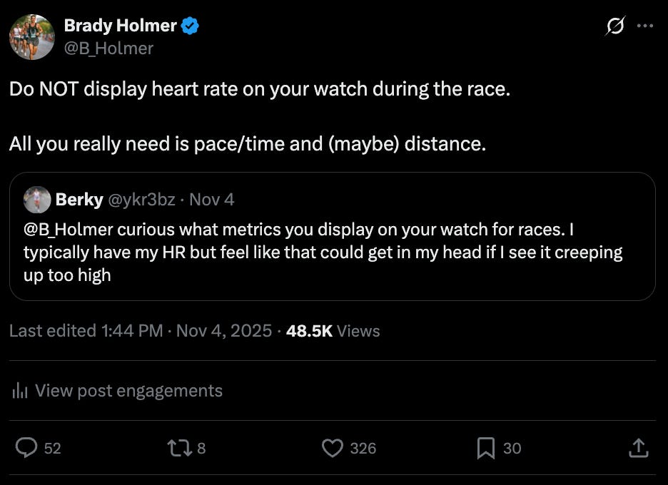 Playback speed×Share postShare post at current timeShare from 0:000:00/0:00Transcript1031Is Heart Rate-Based Training and Racing Useless?My thoughts.Brady HolmerNov 05, 20251031ShareTranscriptDiscussion about this videoCommentsRestacksPhysiologically SpeakingSubscribeAuthorsBrady HolmerRecent PostsPhysiology Friday #285: Q&A on Ketones, Creatine, Endurance Nutrition, Heat Training, and More!Sep 12 • Brady HolmerThe Science of Protein Quality with Dr. Joseph MatthewsAug 11 • Brady Holmer and Joseph Matthews PhDCreatine for the Brain with Dr. Nicholas FabianoAug 4 • Brady HolmerIs Zone 2 Training Optimal for Mitochondrial Health? My Interview with Kristi StoroschukJul 24 • Brady Holmer and krististoroschukSpecial Marathon Training Q&A with the Bone Health & Osteoporosis FoundationJul 2 • Brady HolmerDavid Roche Wants to “Science the Sh*t” Out of UltraRunningJun 25 • Brady HolmerMarathon Training Q&AApr 26 • Brady Holmer