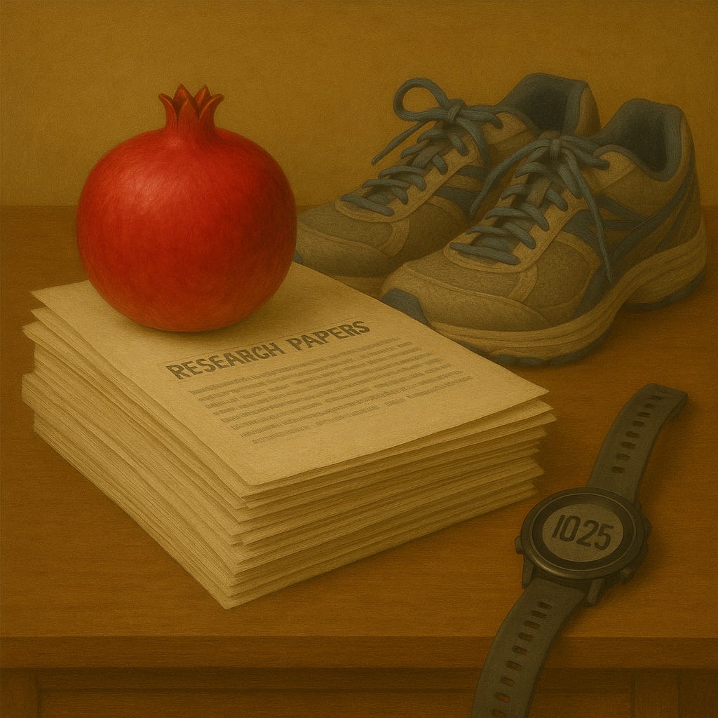 This randomized trial looked at 42 highly trained male distance runners during a 3-week altitude camp. Half took 1,000 mg/day of urolithin A, a gut-derived “postbiotic” made from compounds in foods like pomegranates and walnuts; the other half took a placebo. Everyone followed the same supervised training, did weekly downhill runs to induce muscle damage, and completed lab tests before and after camp, including VO₂ max, hemoglobin mass, running economy, and a 3,000 m time trial.