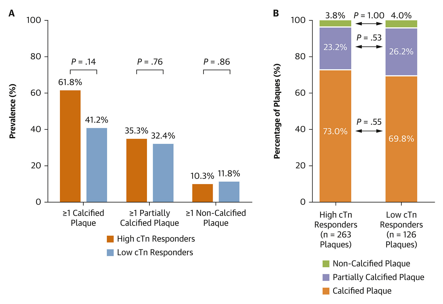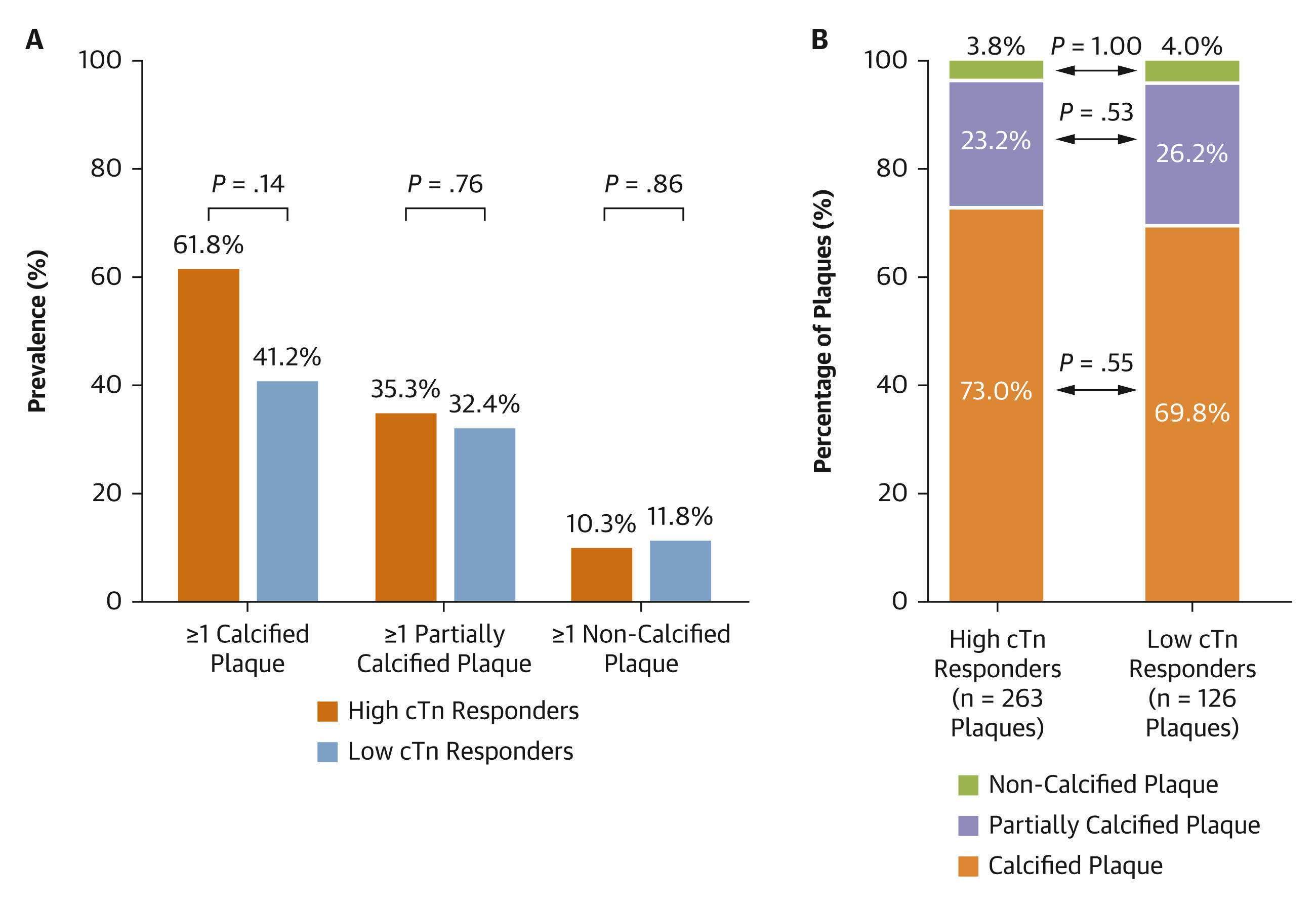 They then took people with the highest levels of post-exercise troponin and the lowest levels (“high responders” and “low responders”, respectively corresponding to 10% of the total study sample with 68 high responders and 34 low responders) and performed scans of their heart (a cardiac CT scan) within 3 months of completing the respective endurance exercise events. These scans were used to obtain a coronary artery calcium score (CAC score), degree of artery narrowing (stenosis), and plaque types (calcified, partially calcified, or non-calcified) for each participant.
