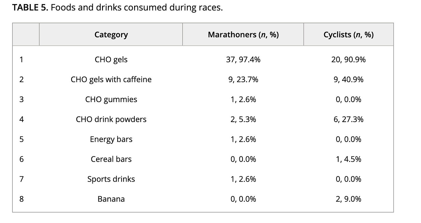 Nearly every athlete relied on carbohydrate gels (97% of marathoners, 91% of cyclists). Cyclists, however, used a more varied mix comprising gels, drink powders, caffeine gels, bars, and even bananas. Marathoners largely stuck to gels alone. This makes sense when you consider the difficulty of consuming anything more than a gel while running. The use of gels likely explains the discrepancy between marathoners’ planned/perceived and actual intakes—gels had the highest leftover rate. They were the most commonly unconsumed product after the race. In contrast, drink powders and gummies were almost always finished.