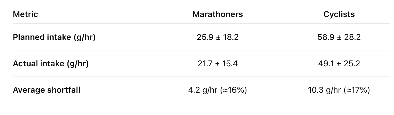 Across the full cohort of marathoners and cyclists, athletes consumed an average of 32 grams of carbohydrate per hour—that’s well below even the lower end of the 60–90 gram per hour recommendation. But the sport-specific breakdown is where it gets fascinating: