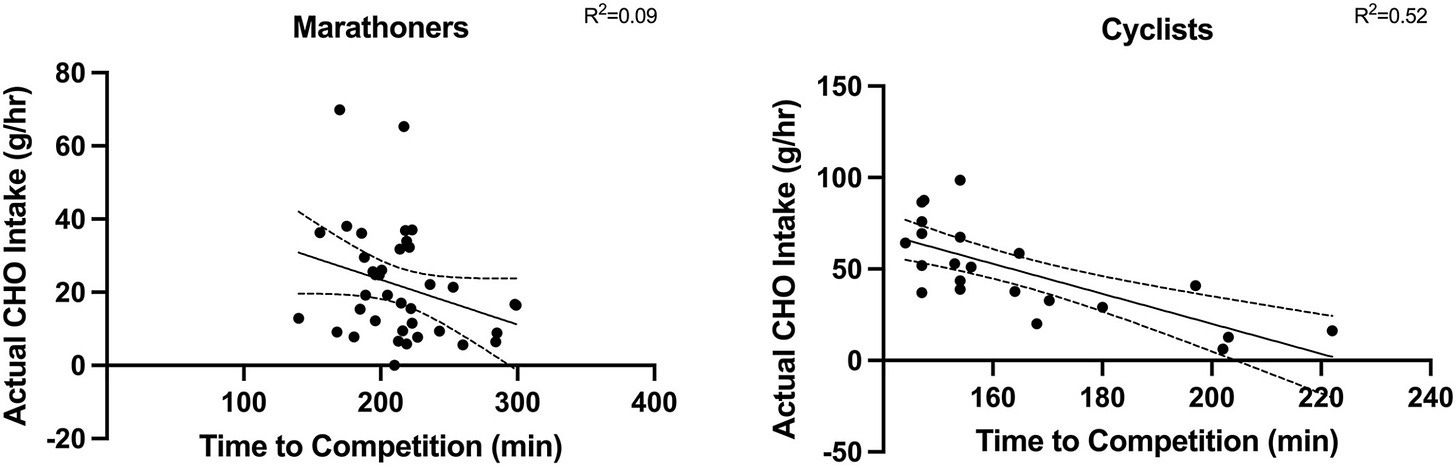 And (most importantly) their actual intake, determined by pre- and post-weighing of every carbohydrate-containing product they consumed (gels, drinks, bars, gummies, etc.) using a lab-grade digital scale.