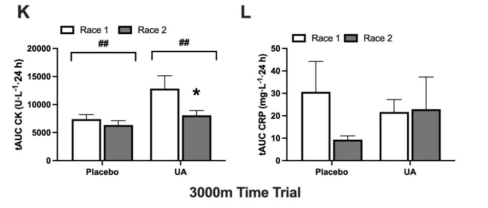 Muscle damage markers (specifically, something called creatine kinase or CK) responses to the weekly downhill runs declined across weeks in both groups (a classic training adaptation), with no clear separation. After the 3000m race, runners taking urolithin A showed a clearly lower CK total response over the next 24 h, whereas those in the placebo didn’t—a signal of reduced exercise-induced muscle damage.