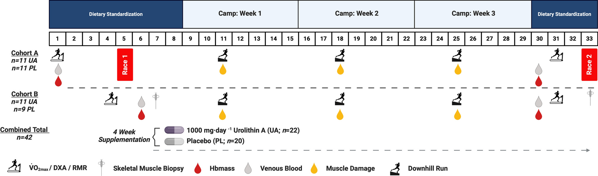 Runners (average VO₂max ~66 mL/kg/min) were randomized to one of two groups: a urolithin A group (22 runners who took 1000 mg per day) or a placebo (20 runners) for 4 weeks spanning a supervised altitude training camp. Everyone had body composition, hemoglobin mass, running economy, 3000m time trial performance, and VO₂max assessed before and after. Each week at altitude, they also completed a ~4.5 km “hard” downhill run to provoke muscle damage and assess how markers of muscle damage and inflammation would respond.