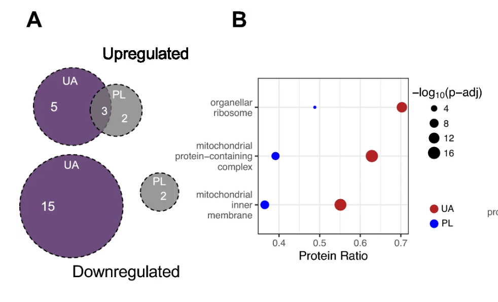 Proteins tied to mitochondrial gene expression nudged up, including an enzyme that transcribes mitochondrial DNA.