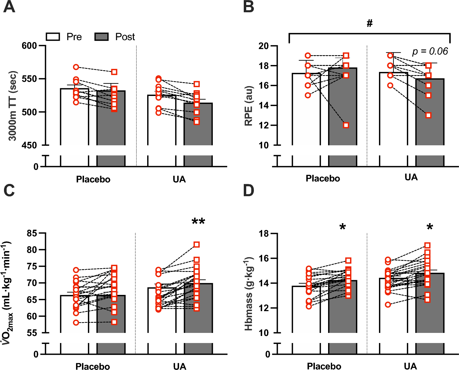 The 3000m performance improved slightly in both groups: those taking urolithin A improved by ~2.3% (~12 seconds) versus ~0.6% (~3 seconds) in the placebo group. RPE (effort) after the post-camp race was lower with urolithin A, meaning the runners reported a lower effort despite running slightly faster.
