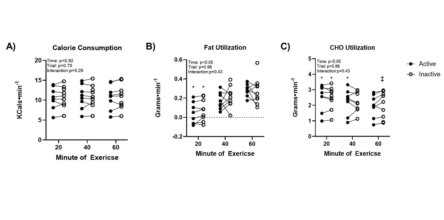 The big finding was that inactivity subtly shaped fuel utilization during exercise. At the end of exercise, carbohydrate oxidation was higher and fat oxidation was lower after the inactive day. The same workout burned a bit less glucose and relatively less fat by the end of the session (this was determined using something called the respiratory exchange ratio or RER, which estimates what fuel your body is using based on the gases—oxygen and carbon dioxide—you breathe out. Higher RER = more carbs being burned, while a lower RER = more fat being burned).