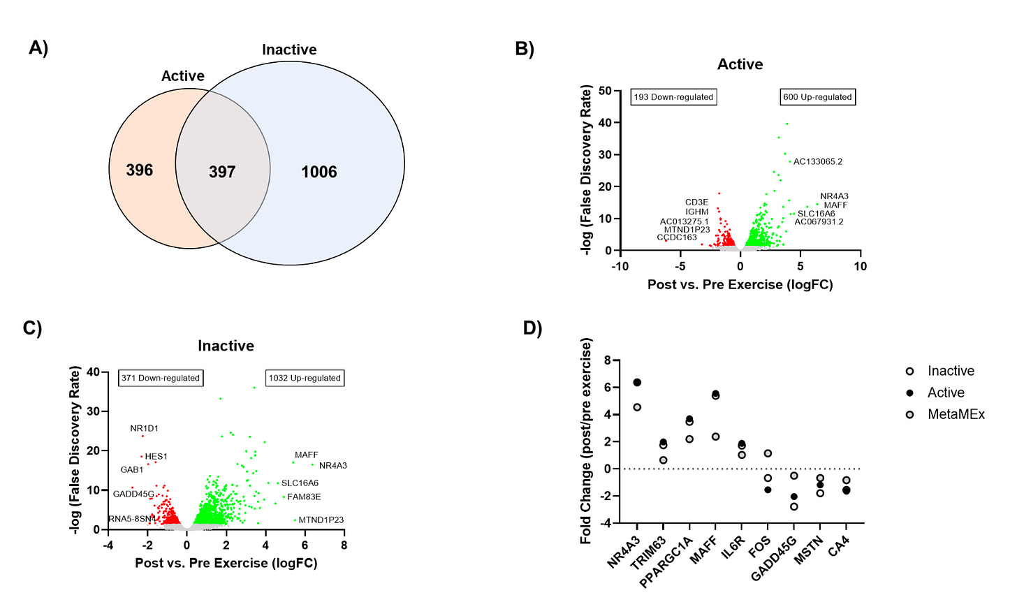 This fits with the data showing more carbs burned at the end of exercise and a broader gene response in pathways related to growth, inflammation, and metabolism after the inactive day.