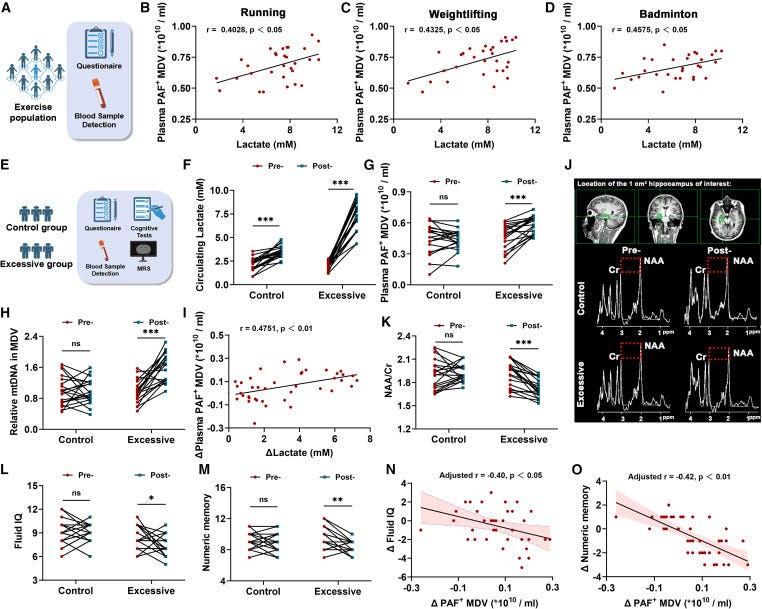 After 6 weeks, both groups had higher lactate after training, but increases were significantly larger in the excessive group. Only the excessive group showed marked increases in MDVs and mitochondrial DNA in those vesicles. The authors also measured something known as the N-acetyl-aspartate to creatine ratio (NAA/Cr) in the hippocampus—a marker of neuronal health. This ratio fell in the excessive group, consistent with neuronal distress, but not in the control group.