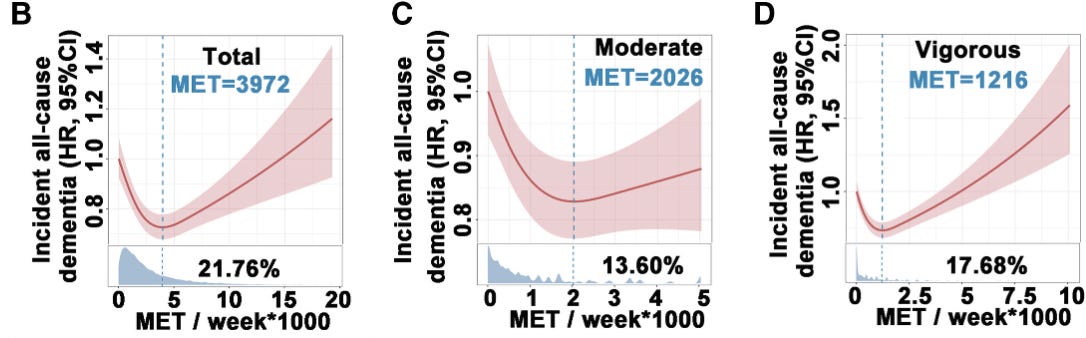 Furthermore, moderate exercise remains unequivocally beneficial. The J-shaped risk curve is steeply protective up to that moderate/vigorous nadir and only bends upward at the far right tail. There’s no signal here that going from inactive to active to moderately vigorous is anything but good for the brain.