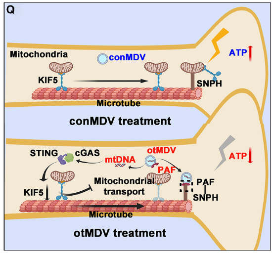 The “mitochondrial pretenders” (the “overtrained” MDVs) attack both of these processes: they downregulate the motor proteins that are crucial for transporting mitochondria along axons in the brain, and they displace “real” mitochondria from anchoring sites on synapses.