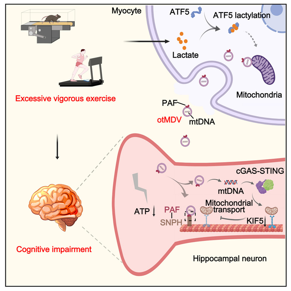 Excessive vigorous exercise did several things to skeletal muscle mitochondria: it led to noticeably swollen mitochondria and several indicators of heightened MDV production. And the MDVs from overtrained mice were distinct from those of the control mice. They were enriched in mitochondrial proteins and had more mitochondrial DNA than typical; they “leaked” into the brain across the blood-brain barrier; and they were causally harmful. Injecting the “overtrained” MDVs into healthy mice was sufficient to impair cognitive performance and elevate markers of synaptic dysfunction in the hippocampus. Conversely, blocking MDV secretion from muscle protected excessively exercised mice from cognitive decline and synaptic loss.