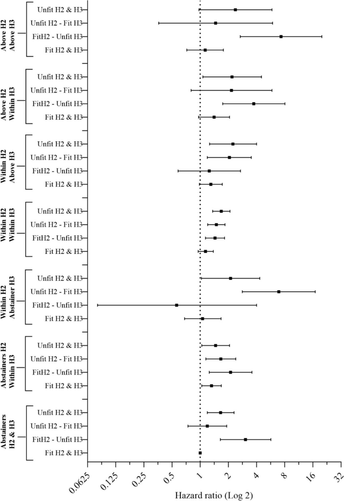 Here, the reference group shifts to a very specific and important comparator: abstainers who remained fit from HUNT2 to HUNT3 (in other words, long-term fitness maintainers).