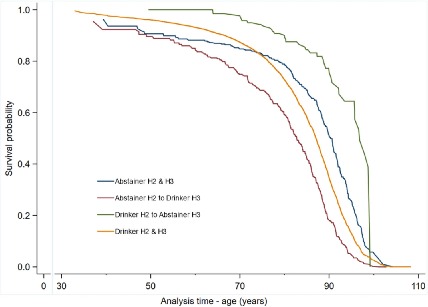 This information was then used to create “change categories.” For example, people who went from being abstainers to drinking within/above the recommendations, drinkers who reduced their alcohol consumption (going from above to within/abstention), or those who maintained their abstention or alcohol consumption habits during the 10-year follow-up.