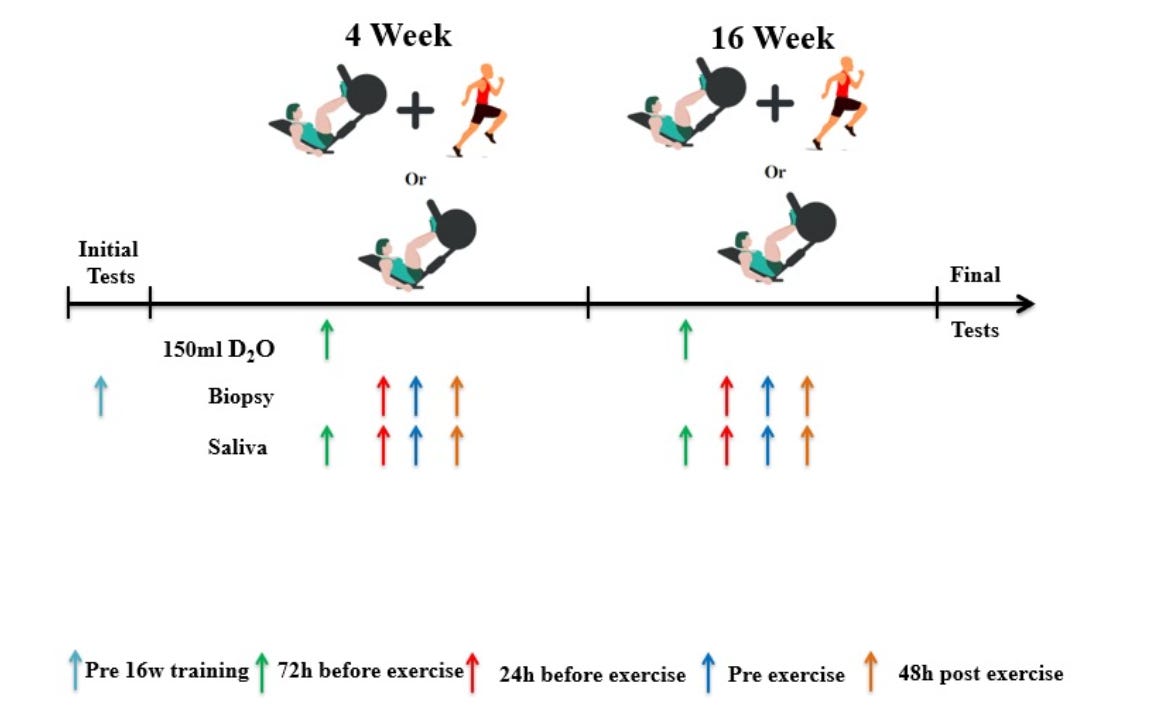 On top of the same resistance program, the concurrent training group performed four weekly aerobic exercise sessions, structured as long-interval HIIT tied to their VO₂peak velocity (essentially, their maximal running speed).
