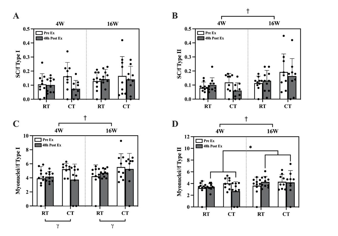After every training session, participants consumed 30 g of whey protein to maximally stimulate muscle protein synthesis (MPS). The researchers assessed muscle strength (1 rep max), aerobic capacity (VO₂peak), type I and type II muscle fiber size (cross-sectional area), and myofibrillar protein synthesis. They also measured muscle satellite cell content, myonuclear number, and gene expression of myogenic regulatory factors—all of which are part of the core molecular machinery that governs increases in muscle size and strength in response to training.