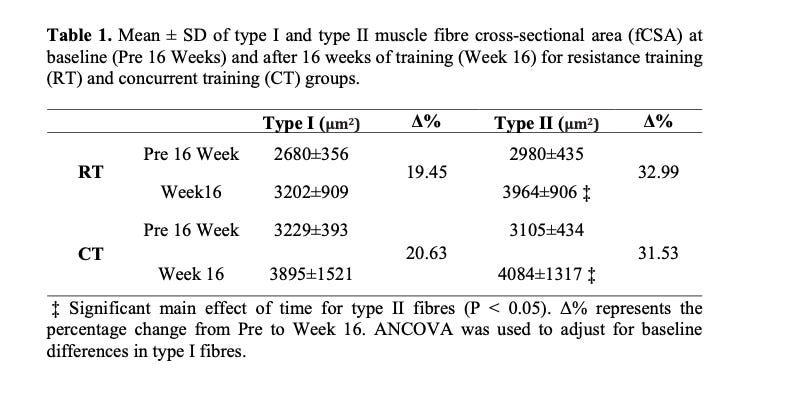 Despite weaker strength gains, muscle fibre hypertrophy was remarkably similar between the two groups: type II fibers grew by ~19% in the resistance training group and ~18% in the concurrent training group. On the other hand, type I fiber size didn’t change in either group, and no clear patterns suggested an interference effect.