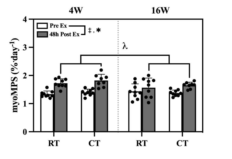 The acute increase in myofibrillar protein synthesis (48 hours post-exercise) increased similarly in the concurrent training and resistance training-only groups when assessed at week 4 and week 16. And even though the post-exercise rise in protein synthesis was smaller at week 16 than week 4 (a normal training adaptation), it occurred in both groups, and was clearly preserved in the concurrent group—HIIT did not suppress the protein-synthesis response supporting hypertrophy.