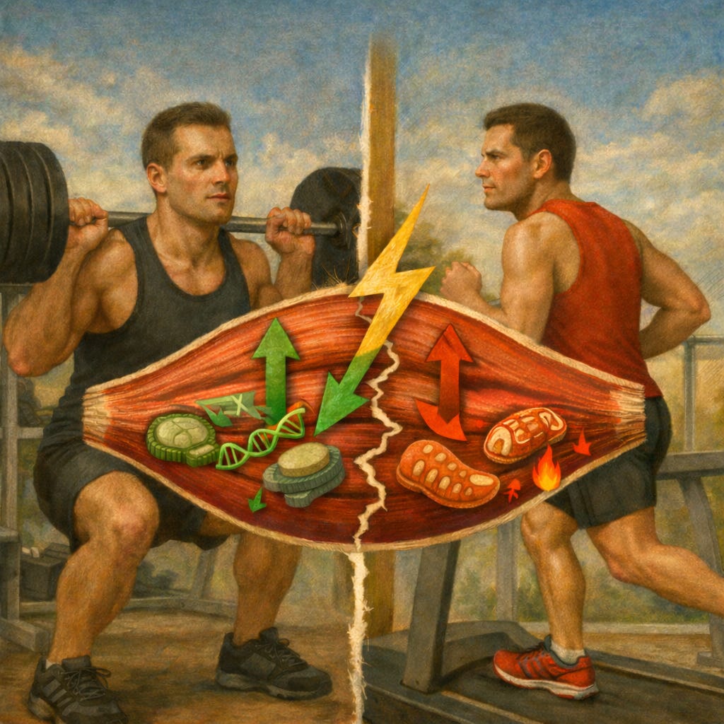 But there’s also a deeper idea that’s been debated for decades—that strength and endurance training might interfere at the molecular level, because the cell seems to receive two competing messages.