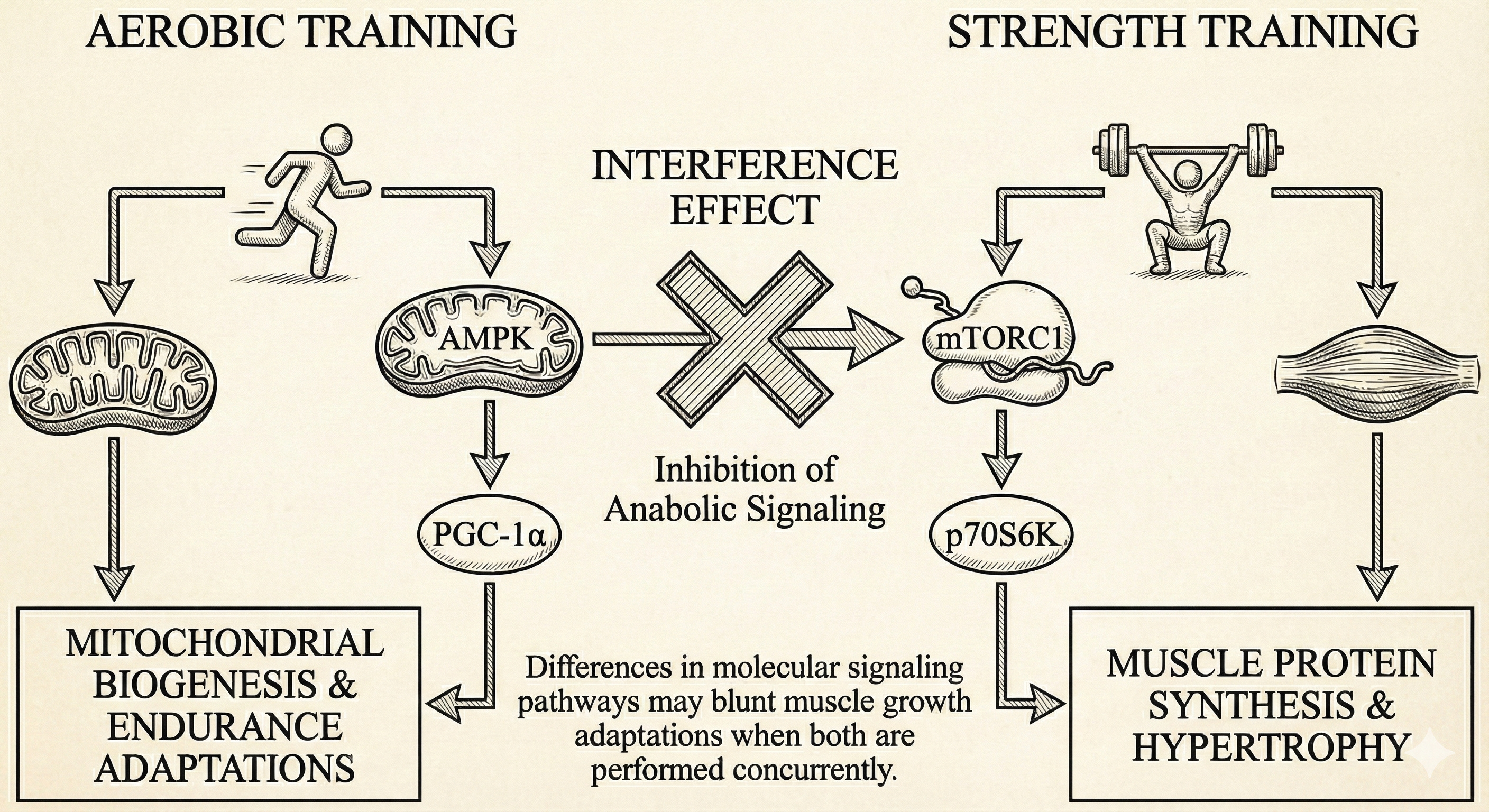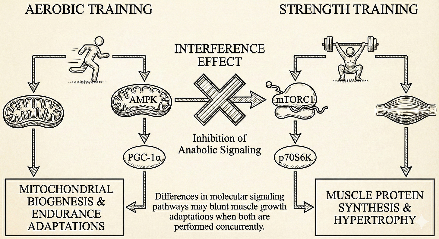 The classic interference model argues that endurance-associated signaling can dampen anabolic signaling, prioritizing energy homeostasis and mitochondrial remodeling over the energetically expensive process of building new contractile protein (and hence, muscle).
