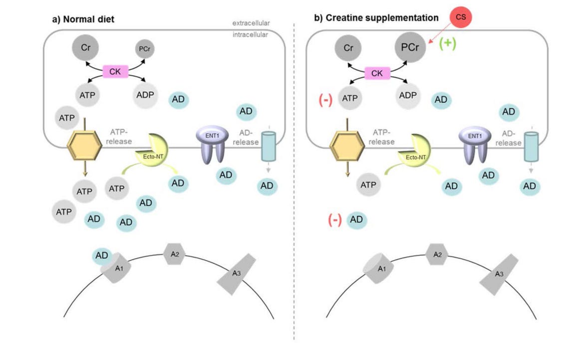 Creatine is a reasonable tool to test that idea because it sits at the center of a rapid energy-buffering system. Creatine and phosphocreatine (PCr) help stabilize ATP availability when energy demand changes quickly—something that matters in tissues like skeletal muscle and the brain. The researchers behind this paper asked whether chronic creatine supplementation could reduce homeostatic sleep pressure—particularly after sleep deprivation—by altering brain energetics and the accumulation of adenosine, one of the key molecular signals tied to sleepiness (adenosine is what caffeine blocks and hence, why it makes us feel less tired).