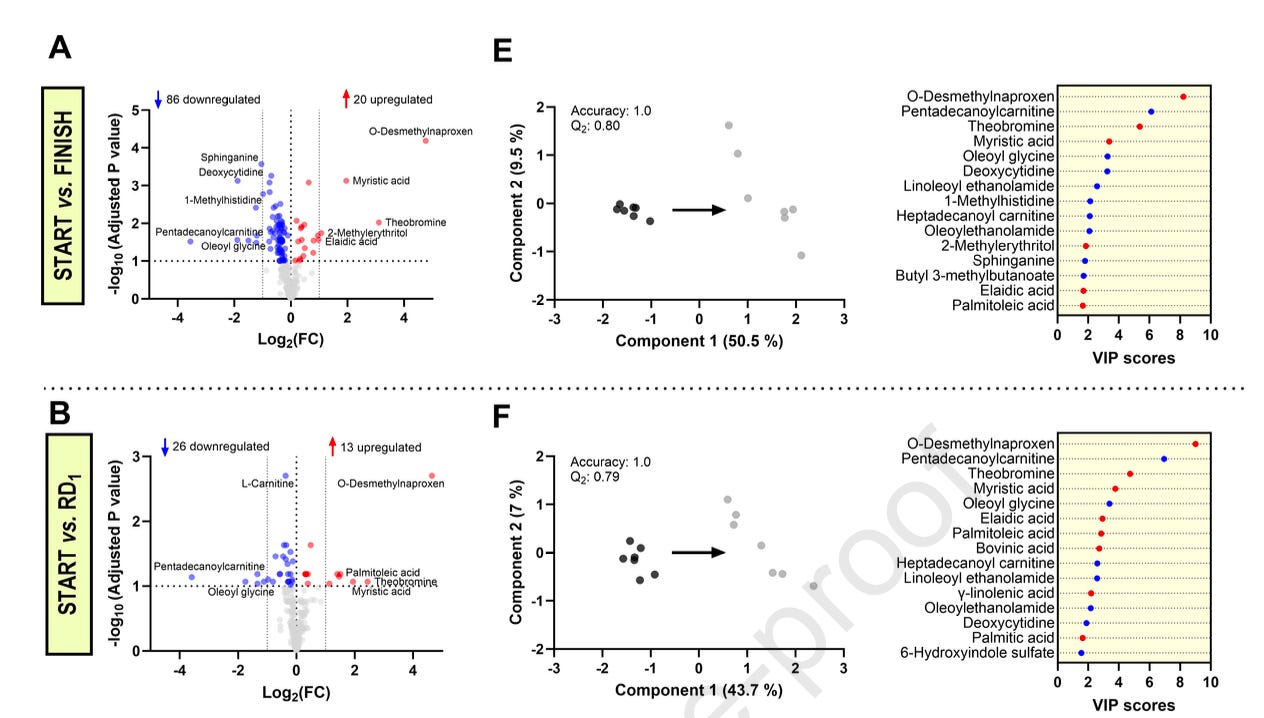 Along with just being a truly interesting and one-of-a-kind study in an elite subpopulation of athletes, this paper provides a ranked list of candidate signals that move in lockstep with perceived fatigue under extreme real-world training load. These signals are tied to cell membrane biology, mitochondrial throughput, and a broader theme of metabolite depletion outpacing replenishment.