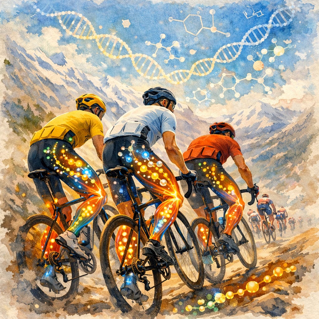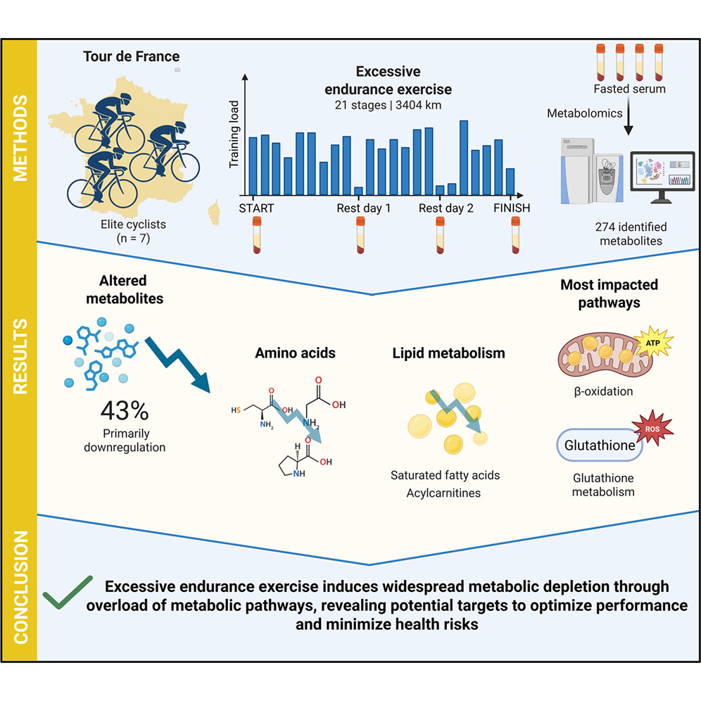 The researchers followed 7 professional male cyclists during the 2023 Tour de France (one rider crashed and was subsequently excluded), collecting fasting blood samples in the morning at four time points: the start of the race, on rest day 1 (day 10 of the Tour), on rest day 2 (day 17 of the Tour), and the finish.