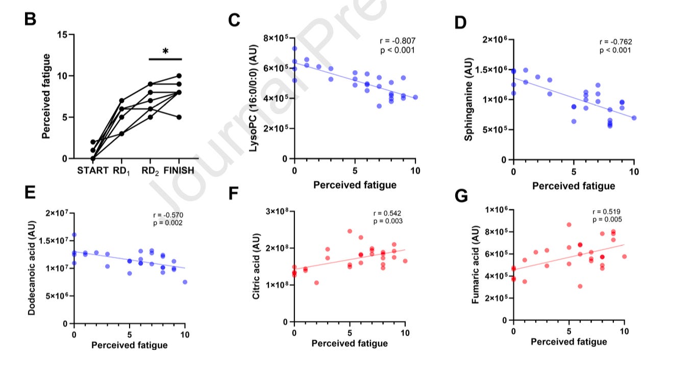 The strongest negative correlations were lysophosphatidylcholine (LysoPC, a derivative of phosphatidylcholine) and sphinganine. Both sit in the world of cell membrane metabolism, prompting the authors to suggest that cell membrane dynamics may play a role in fatigue development.