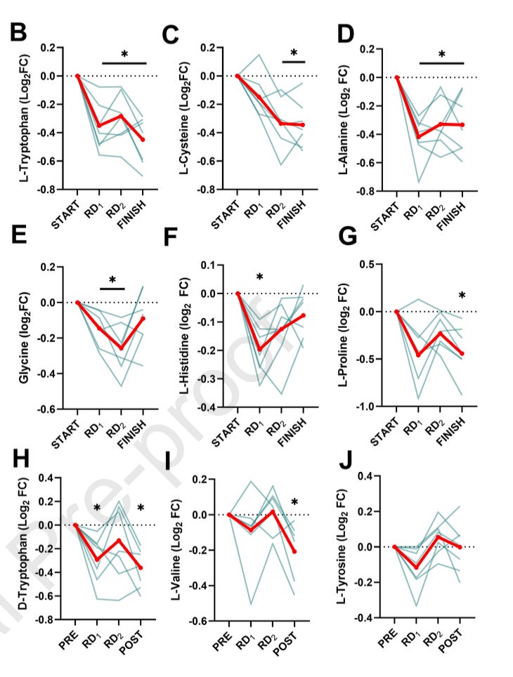 The results also highlight cysteine as the most depleted semi-essential amino acid, showing a continuous decline across all cyclists. They connect this to increased production of reactive oxygen species (ROS). How’s this tied to glutathione? Remember that glutathione is the primary intracellular antioxidant. Because cysteine is the rate-limiting substrate for glutathione synthesis, progressive cysteine depletion may reflect heightened demand for glutathione production to buffer oxidative stress.