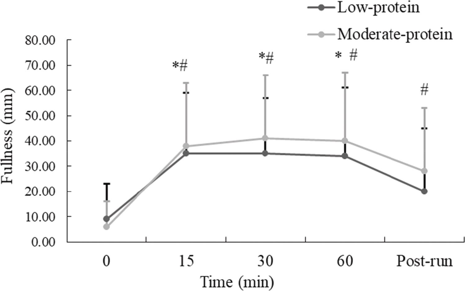 Gut fullness rose after the shake, peaked around 30 minutes, and didn’t differ much between shakes. Statistically, the two conditions weren’t different—but practically, there was a subtle pattern that in the moderate-protein condition, fullness stayed above fasting levels through all time points, including post-run, suggesting protein (or extra calories) may leave that fullness sensation hanging around longer (for better or worse).