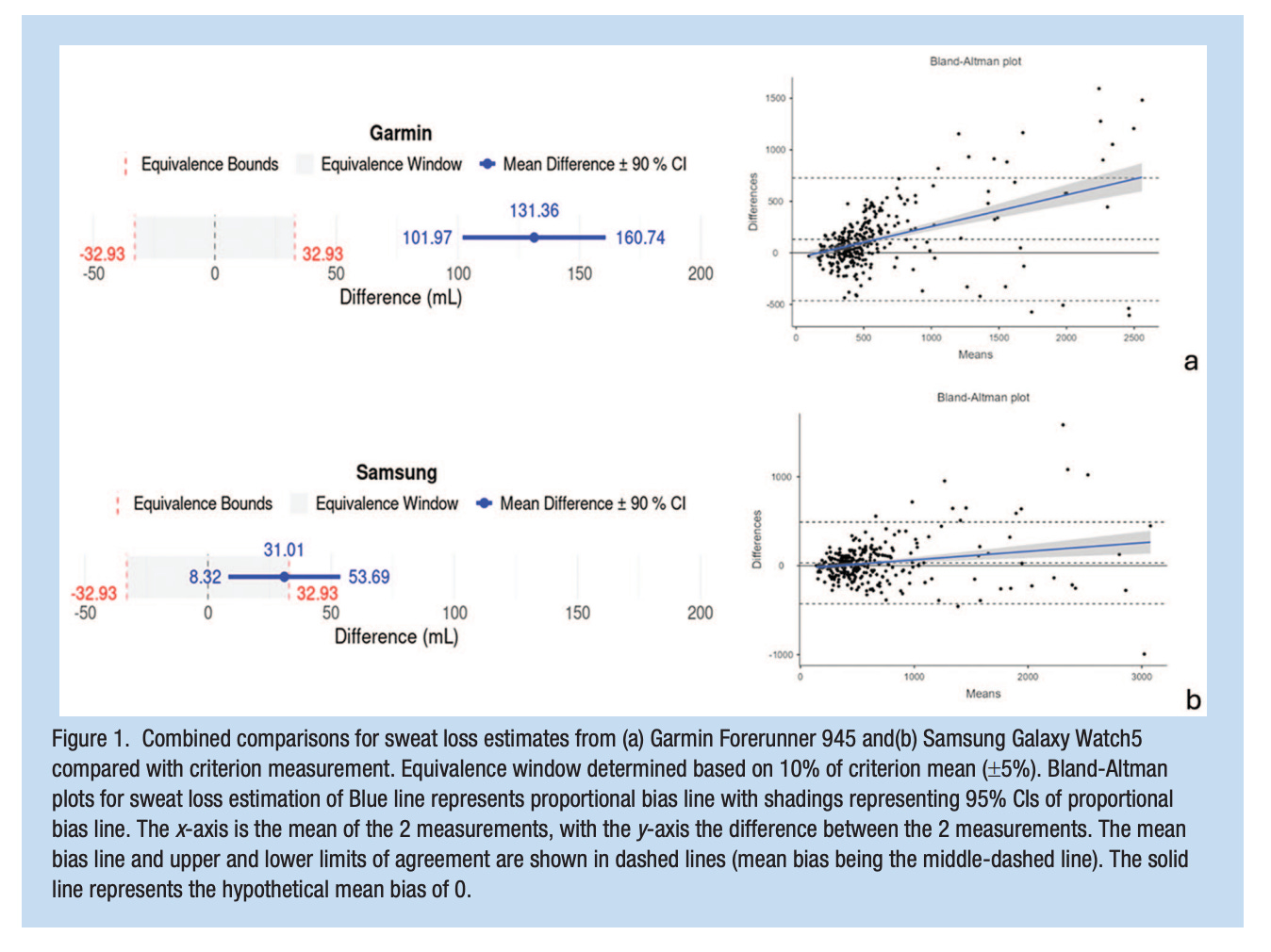 The correlation looked decent, especially for Samsung (0.90) and still “okay” for Garmin (0.77), meaning the watch’s estimations were generally in line with the direction and magnitude of actual sweat loss. But the error for the devices was high: Samsung’s average absolute percentage error was ~25%, and Garmin’s was ~33%. In plain terms: if you truly lost 1000 mL, your watch might reasonably tell you you lost ~670 mL… or ~1330 mL!
