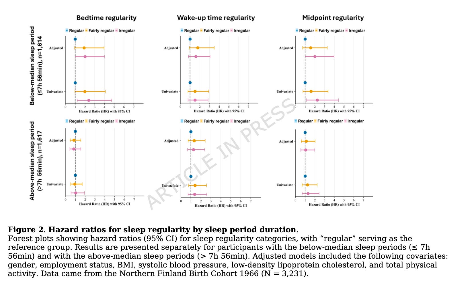 We have to note one of the main limitations here. Sleep timing regularity was measured over only seven days at baseline, which may or may not capture an individual’s longer-term habitual behavior across seasons, stressors, or life transitions. How someone slept during one particular week might not reflect how they slept during the nearly 11-year follow-up period.