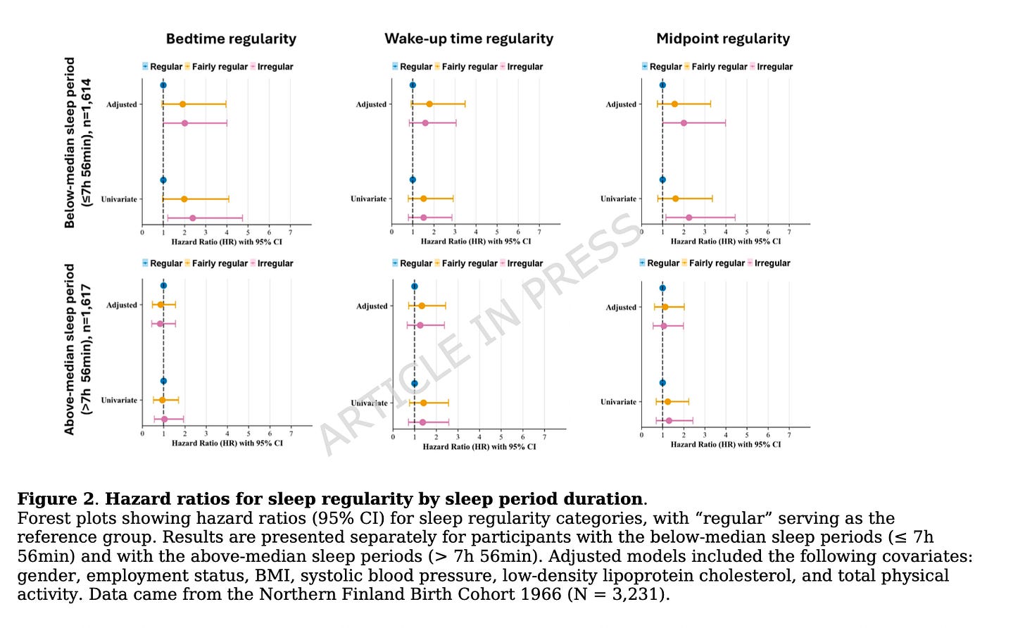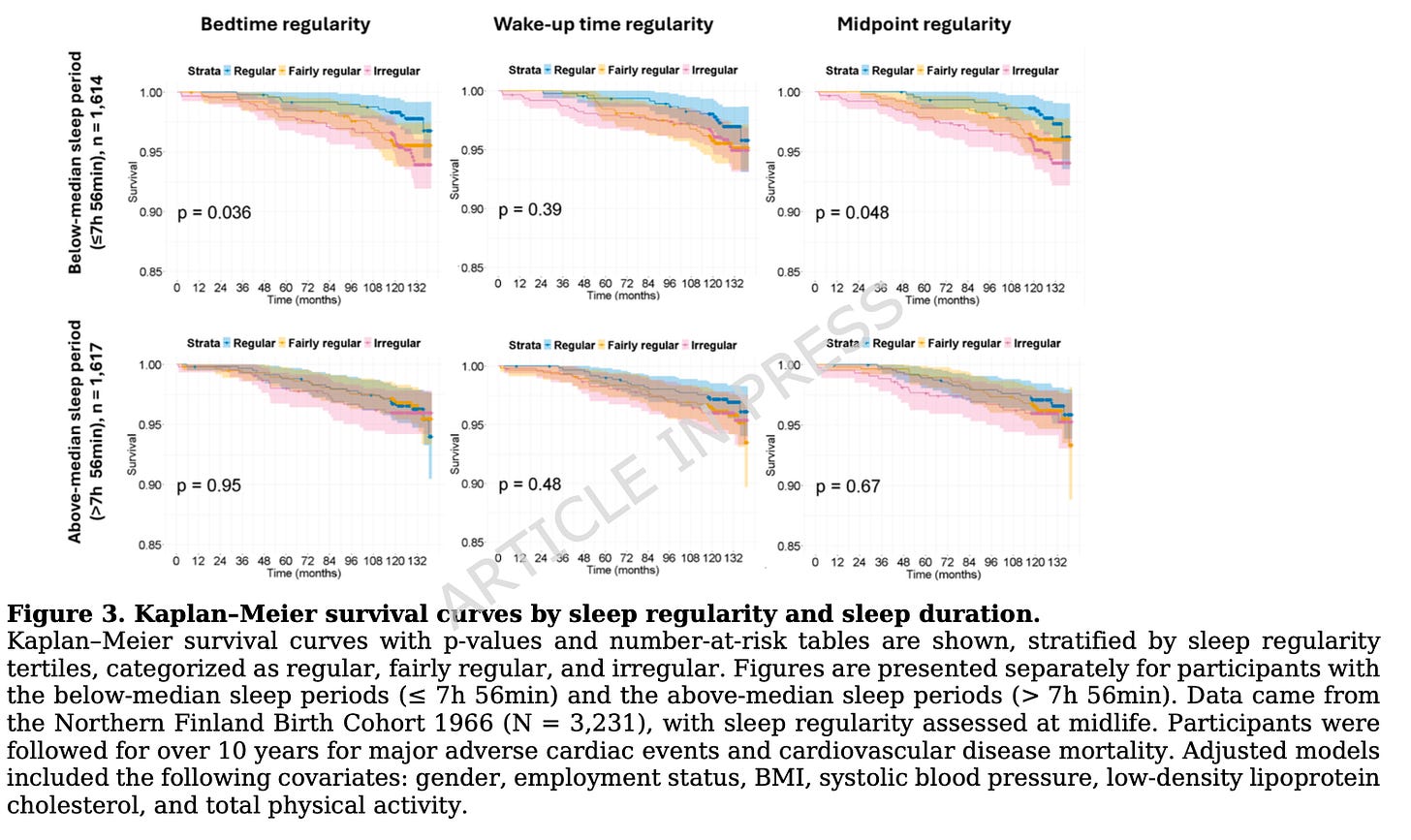 This is a very particular result, and it somewhat contradicts previous findings that sleep regularity is harmful even among people getting enough sleep. This study wouldn’t support that. It’s only among people sleeping somewhat less than eight hours that the instability of when one goes to bed (and their midpoint of sleep) seems to matter for heart disease risk.