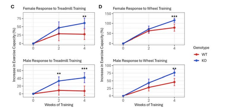 Once the mice started training, the difference became obvious. In a treadmill training protocol, the knockout mice improved dramatically more than wild-type controls. After four weeks, they gained 3.3 times more fitness overall. Male knockouts gained 5.7 times more.