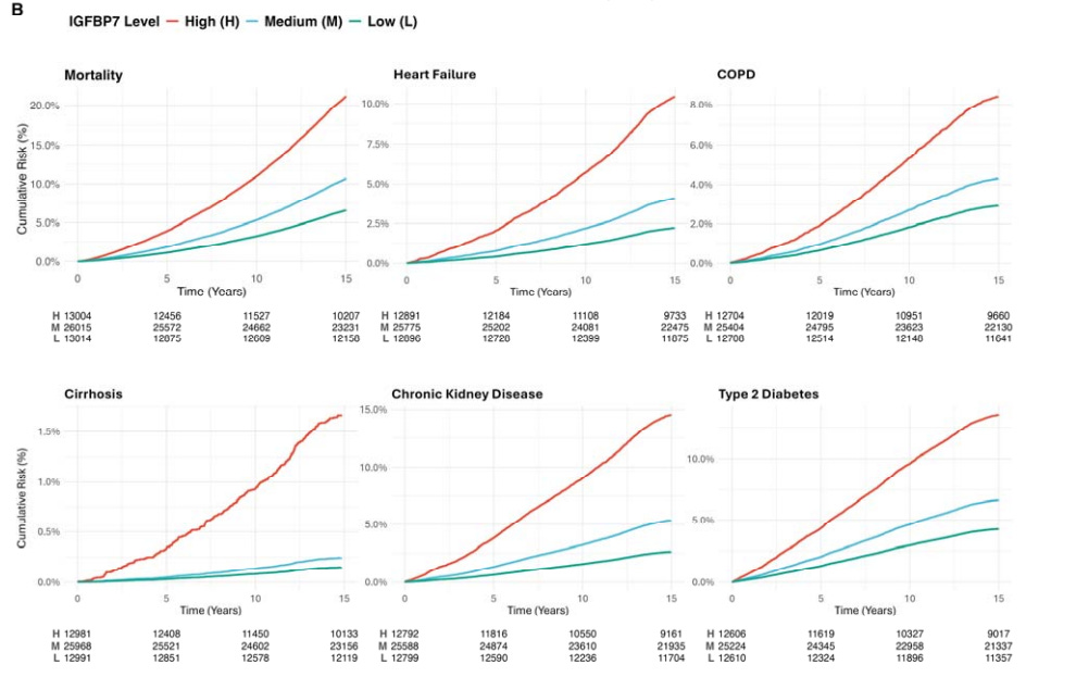 The final layer of the paper zooms out from exercise performance to long-term health (something we are all interested in) using UK Biobank data from 52,033 participants followed for about 16 years. After adjusting for age and sex, lower IGFBP7 levels were associated with a lower risk of all-cause mortality, heart failure, COPD, cirrhosis, chronic kidney disease, and type 2 diabetes. When participants were grouped based on their baseline levels of IGFBP7, those with the highest levels had a 2.9- to 11-fold greater disease rate than those with the lowest levels across these outcomes.