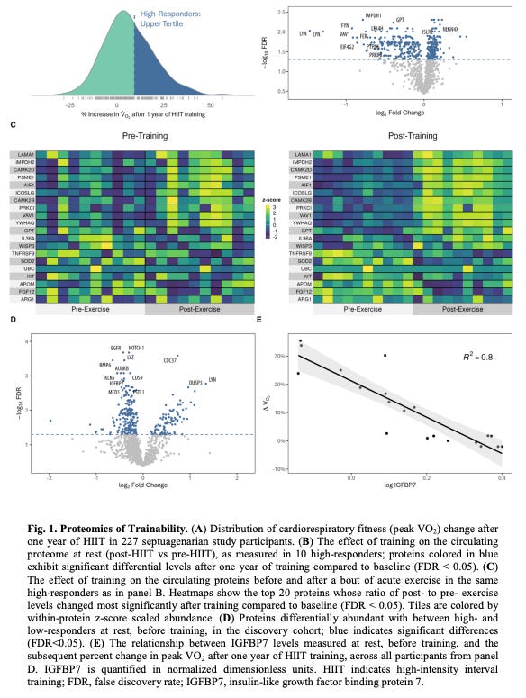 The same molecular systems that determine whether your body responds to a training block may also help determine how well it resists heart failure, kidney disease, diabetes, or the slow erosion of function that comes with age. And IGFBP7 may be one of the clearest molecular signals yet identified that helps explain why. In fact, this could be one potential explanation for the broader link between VO2 max and longevity that I’ve covered so extensively. While I do think that aerobic fitness is protective in the sense that it reflects the body’s overall capacity to coordinate oxygen delivery and energy production, this paper would suggest it may also reflect physiological plasticity—the processes that allow someone to obtain a high level of fitness in the first place are also important for guarding against death and disease.