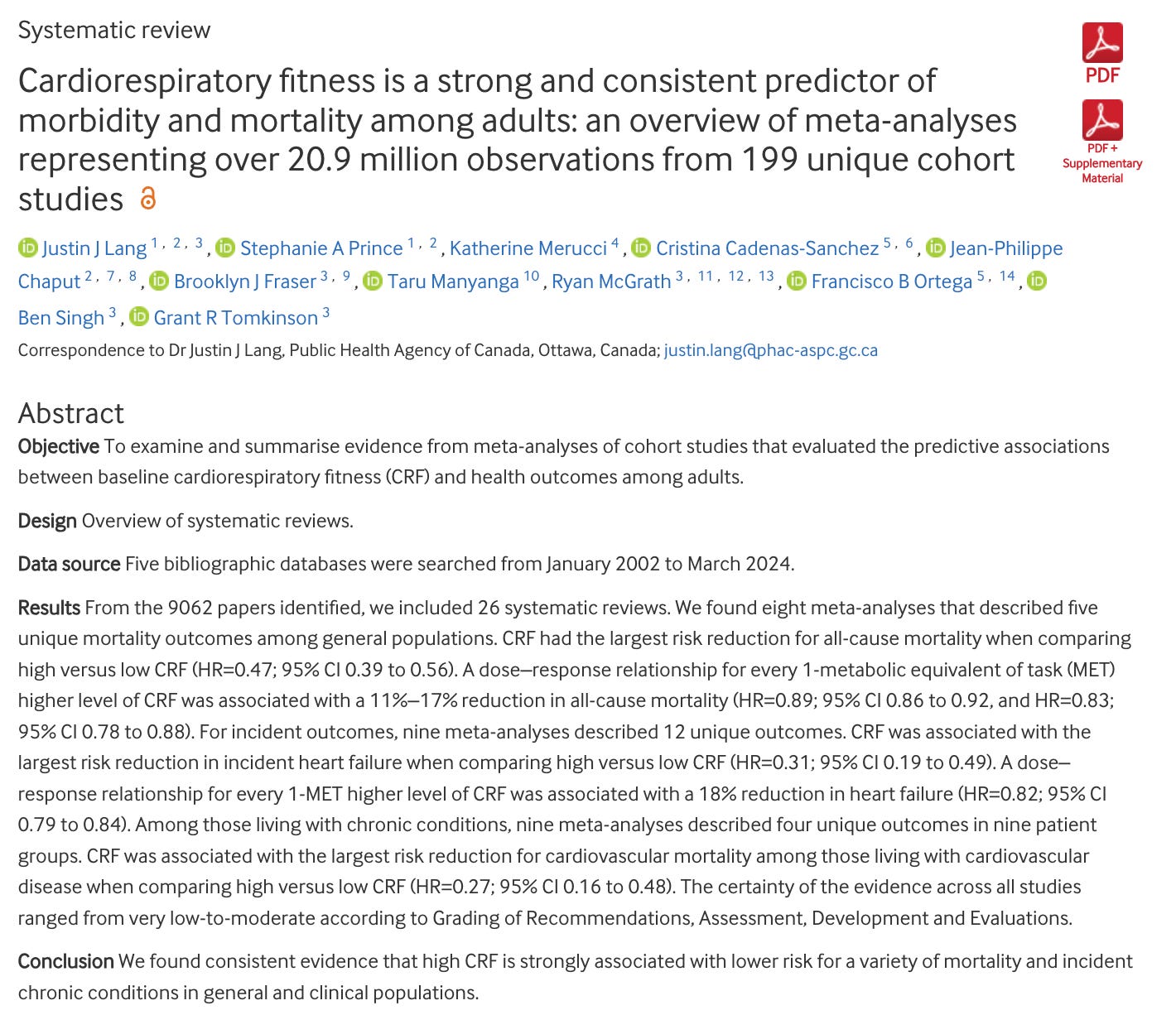 Those are impressive associations, but the certainty should not be overstated. The same overview rated the certainty of evidence across outcomes from very low to moderate. That does not weaken the overall signal, which is clearly strong and consistent, but it does argue for some caution when translating these epidemiologic associations into sweeping mechanistic claims. And I should note that many studies here were not actually about directly measured VO2 max. They are about CRF more broadly. So let’s discuss that…