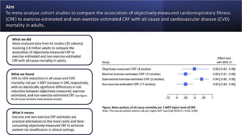 This arose because many of the most cited mortality studies do not rely on direct breath-by-breath laboratory measurement of VO2 max. Instead, they often use objectively measured exercise capacity expressed in METs, treadmill-estimated CRF, or even non-exercise CRF estimation models.